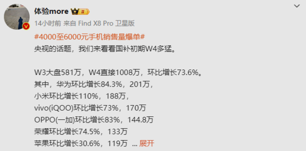 把柄博主曝光的数据,本年第三周手机市集销量为581万台,国补初期的第四周径直来到了1008万台,环比增长73.6%。从各个厂商来看: